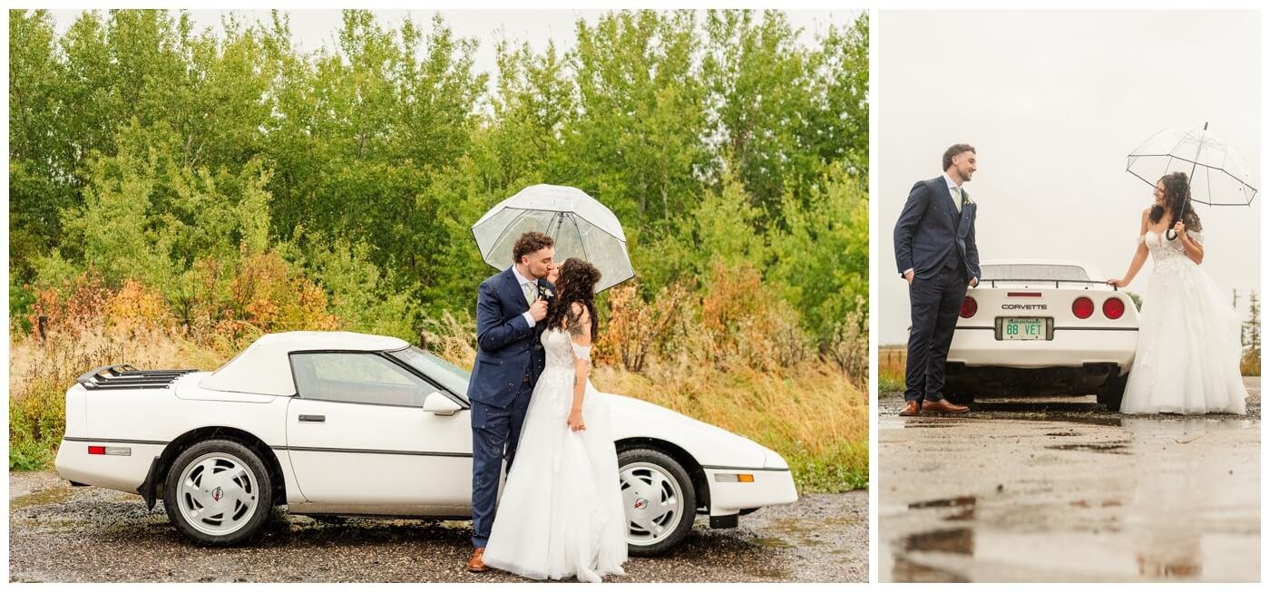 The rain fell steadily throughout the day, so outdoor portraits became a careful dance of timing and umbrellas. But we knew how much it meant to them to include Hanna’s beloved 1988 Corvette that her grandfather had given her. Even if it was just going to be for a few quick frames, we wanted to make it happen. Rain-speckled hair, damp shoes, and all—it was worth it. Those moments perfectly captured who Blayde and Hanna are: willing to roll with whatever life throws their way, and continue to find joy in the middle of the unexpected.